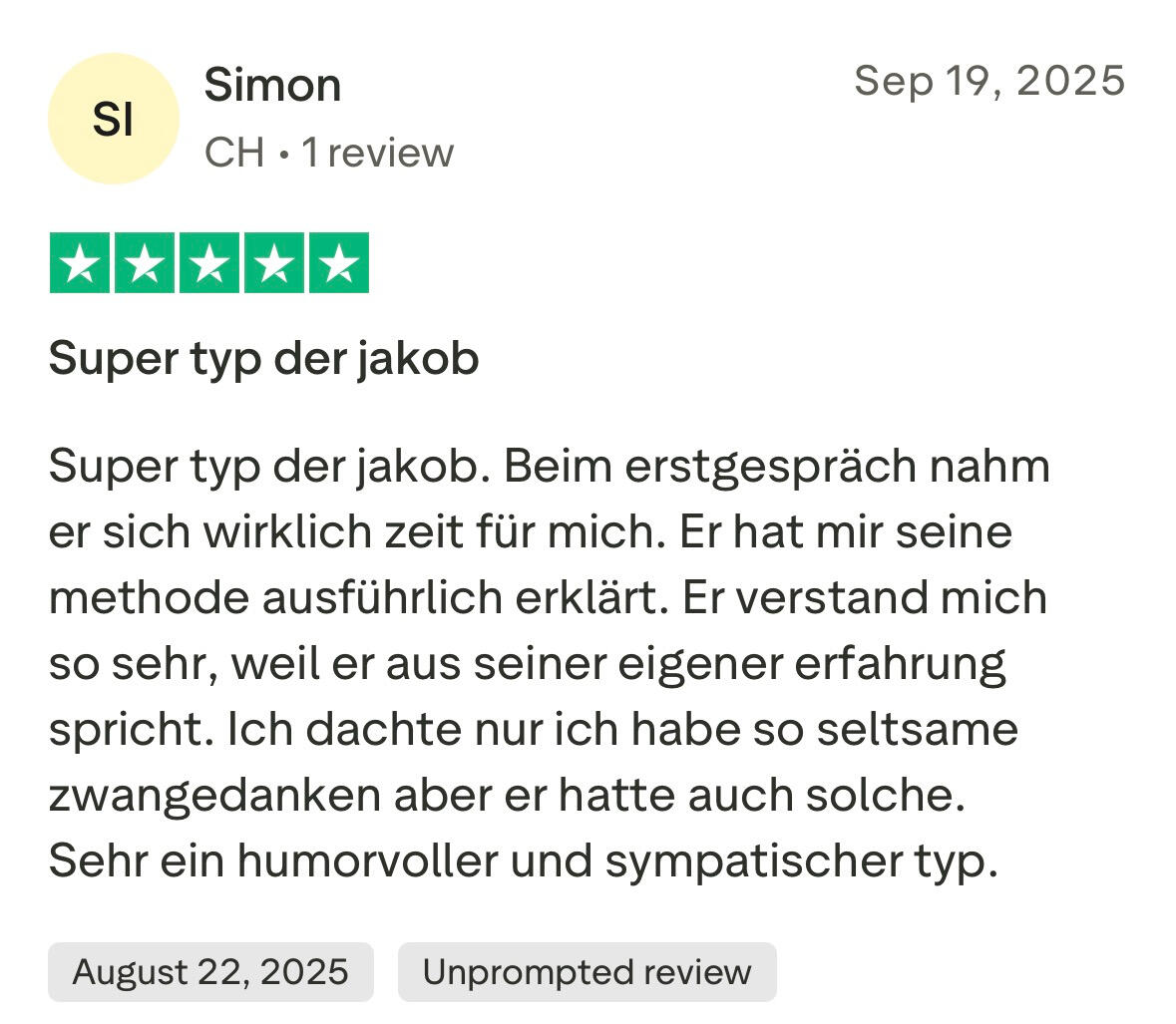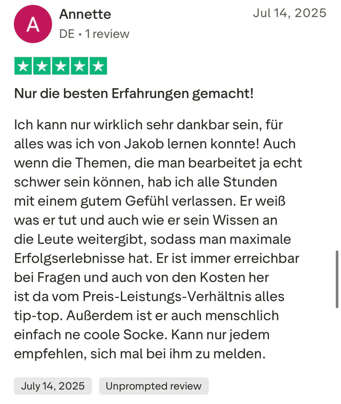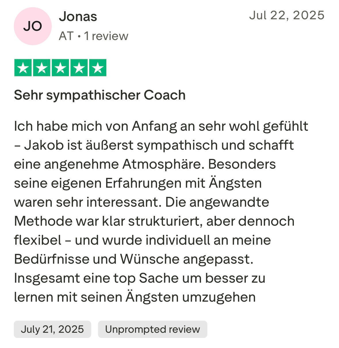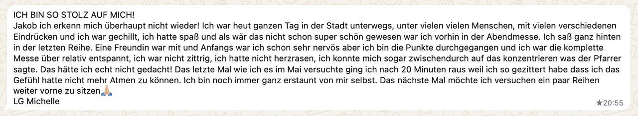 In einem kostenlosen Erstgespräch zeige ich dir meine einzigartige 5 Schritte-Methode und wie du sie direkt auf deine Angstsituation anwenden kannst.Danach entscheidest du, ob du beim Programm mitmachen möchtest – oder nicht. Egal, wie du dich entscheidest: Wir bleiben Freunde – versprochen :)Trage dich heute noch für ein kostenloses Erstgespräch ein und sichere dir die Chance auf ein exklusives Geschenk im Wert von über 240€ - als Dank für deinen Mut. (sprich mich im Gespräch einfach dazu an)Ich freu mich auf dich!