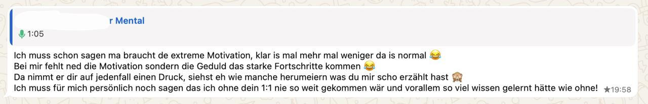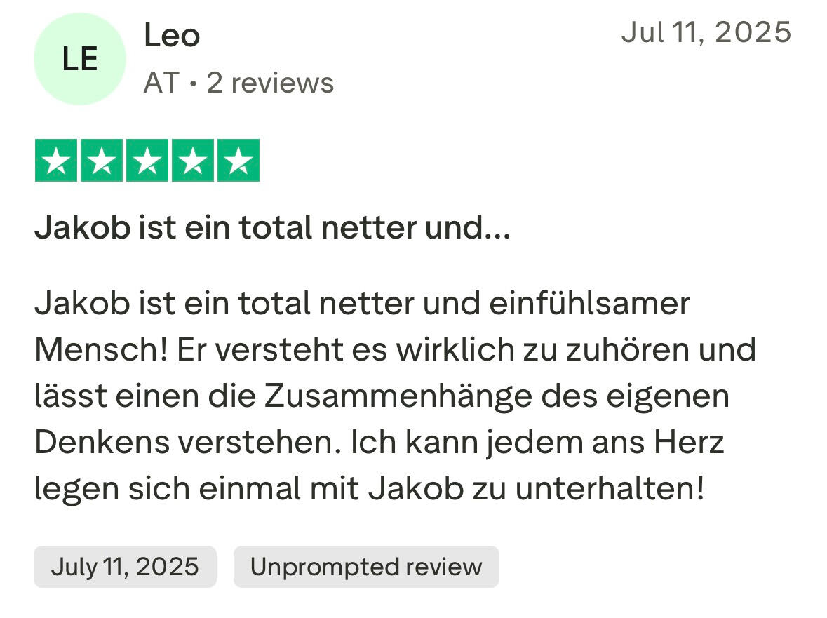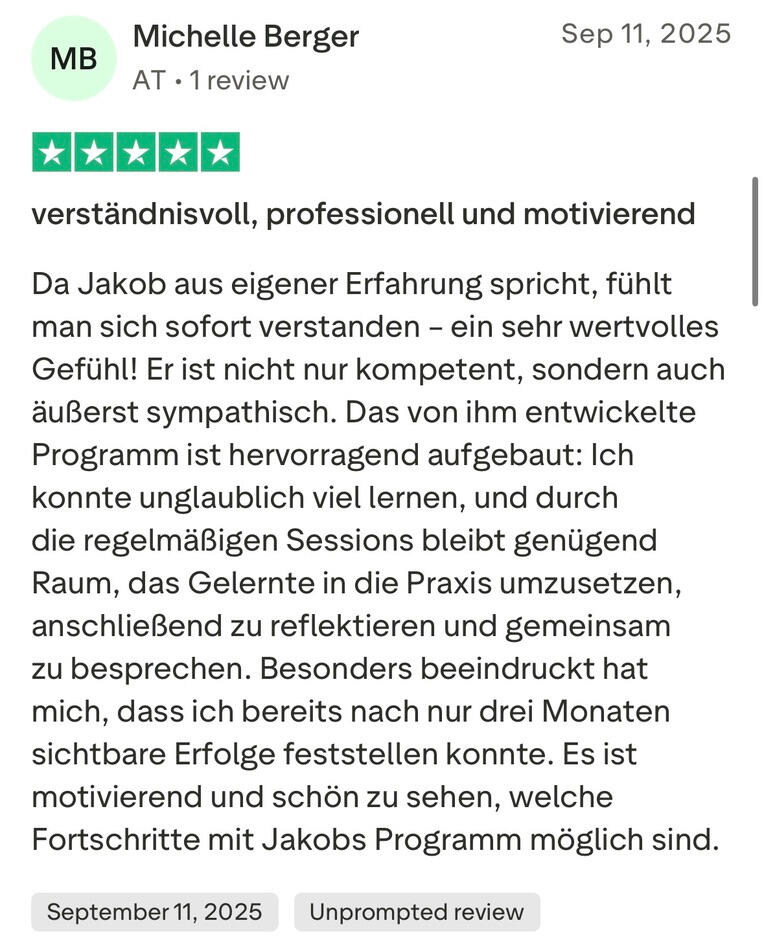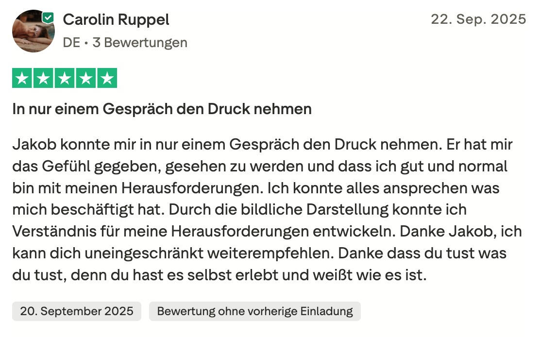 In einem kostenlosen Erstgespräch zeige ich dir meine einzigartige 5 Schritte-Methode und wie du sie direkt auf deine Angstsituation anwenden kannst.Danach entscheidest du, ob du beim Programm mitmachen möchtest – oder nicht. Egal, wie du dich entscheidest: Wir bleiben Freunde – versprochen :)Trage dich heute noch für ein kostenloses Erstgespräch ein und sichere dir die Chance auf ein exklusives Geschenk im Wert von über 240€ - als Dank für deinen Mut. (sprich mich im Gespräch einfach dazu an)Ich freu mich auf dich!