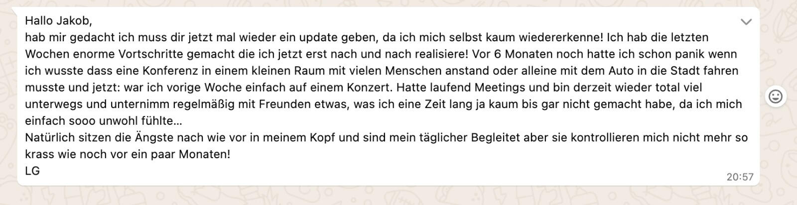 Denn ich glaube, es gibt wenig Wertvolleres im Leben, wie wieder ein entspanntes Leben ohne Einschränkungen führen zu können.Wann immer du bereit bist, deinen Ängsten die Stirn zu bieten – dann lass uns quatschen.