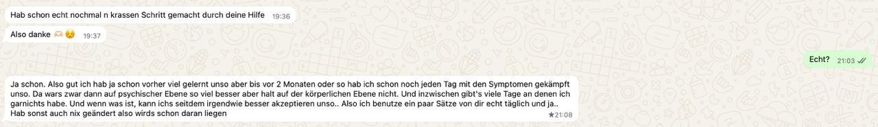 Verlieren wir also die Angst vor diesen Symptomen, kann sich auch unser Nervensystem wieder entspannen und die Symptome verschwinden automatisch, ohne dass wir proaktiv etwas dafür tun müssen.Und genauso war es bei mir. Ich hatte locker 15-20 psychosomatische Symptome und alle sind wieder in dem Maß verschwunden, wie sich mein Nervensystem wieder beruhigt hatte.